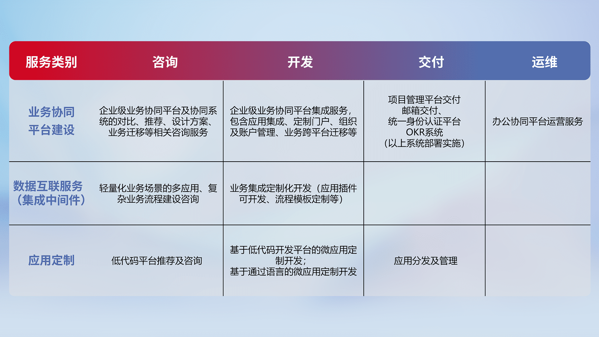 针对钉钉、、、、企微、、、IDaas等平台级产品提供产品的规划、、、、方案、、、交付、、、定制化开发等服务,,实现如统一协同办公、、、智能客户服务、、、、混合会议管理、、智能数据查询、、、、等业务场景,,实现数字化转型。。。
