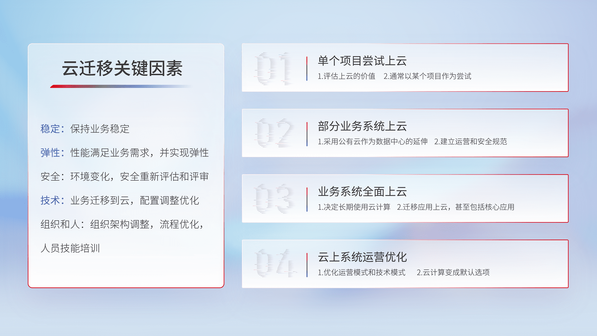 结合实际业务,,,,从规划设计、、、、云平台选型、、、、云原生改造、、、数据迁移、、、、集成交付,,迁移全过程为客户识别最佳上云路径,,,做好风险识别管理,,,,设计网络架构、、身份权限、、、、安全审计合规、、、操作审计、、日志审计、、、监控告警策略、、、、多站点容灾设计等,,,,对云上基础设施进行整体规划,,,提升IT治理水平,,,,以满足弹性、、高可用、、、高性能的需求。。