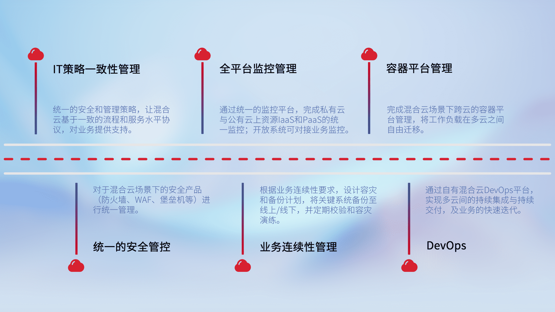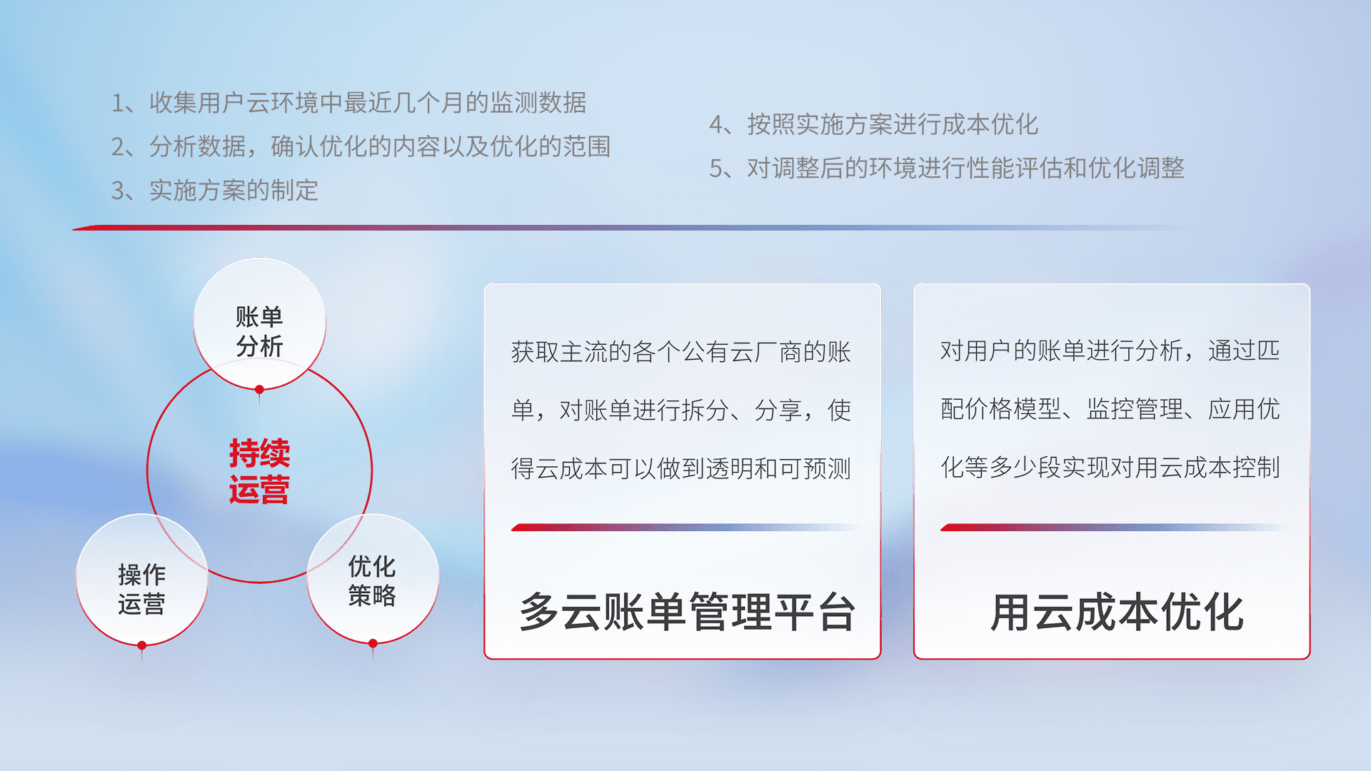 通过多云纳管,,以统一的资源数据模型把客户的云资源进行抽象和封装,,,进而实现对多云资源的统一操作,,,,保障云资源管理的可靠性、、、、稳定性与可用性。。。量身定制化运维内容,,配置、、开发运维、、、、补丁管理、、、备份、、、监控、、、、认证和访问管理、、、、审计和日常巡检等,,,,保障在用云过程中的可靠度,,,稳定度以及高可用率。。。